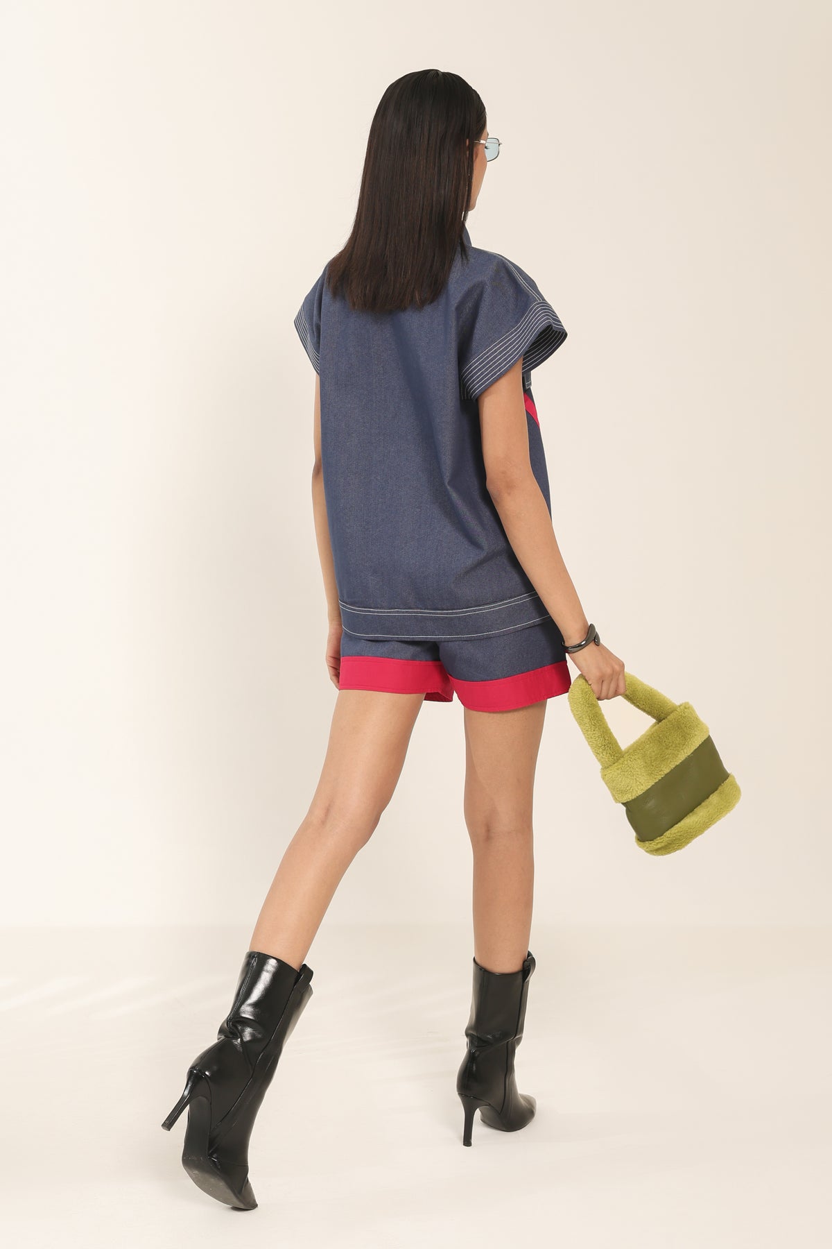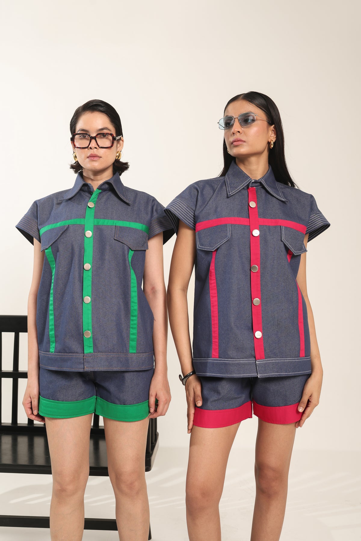 Make a bold statement in our denim co-ord set highlighted with striking pink accents. The tailored top features flap pockets and vivid pink contrast lines, perfectly paired with pink-trimmed denim shorts. Designed for comfort and modern flair, this look is ideal for day-to-night styling.