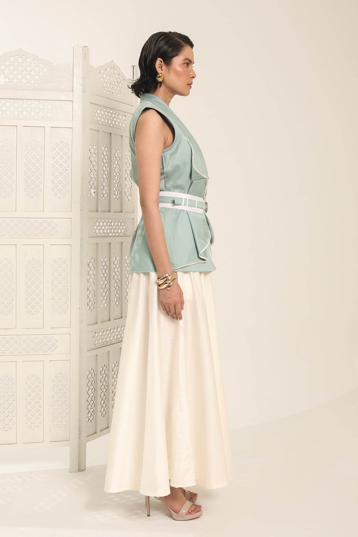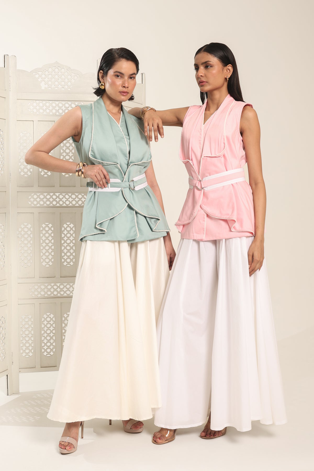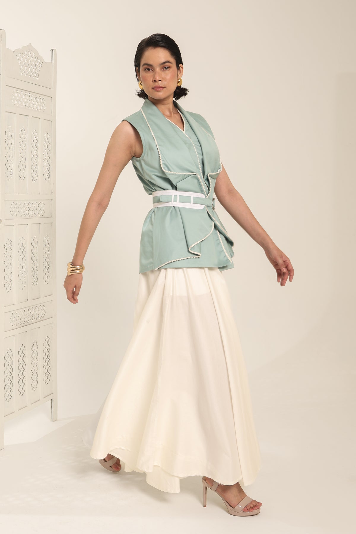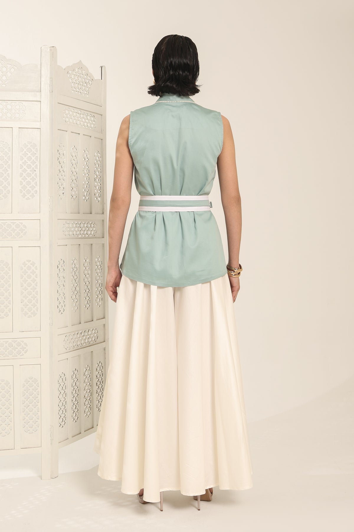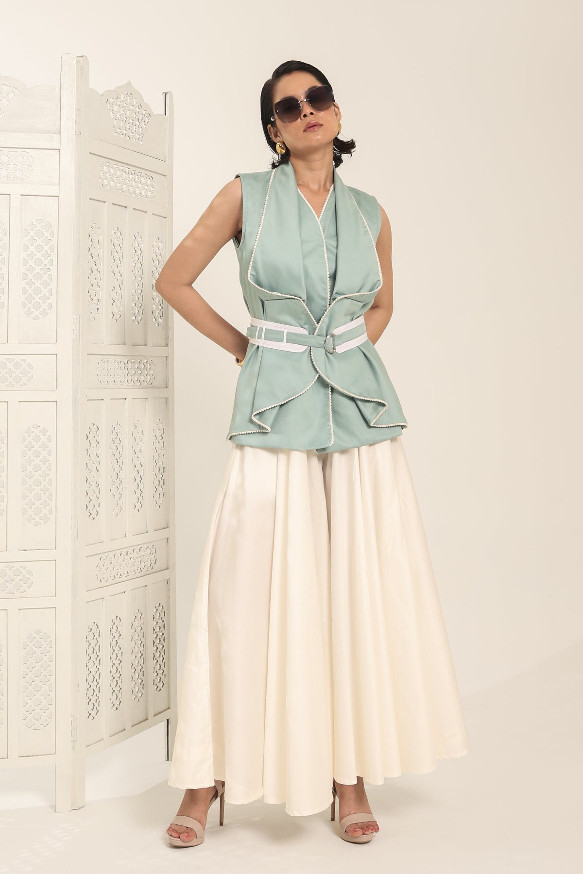 Soft yet structured, this mint green co-ord set features a sleeveless draped top with contrast white piping and a matching white belt to cinch the waist. Paired with wide ivory flared bottoms, the look blends pastel charm with elevated elegance—perfect for summer soirees or day events.